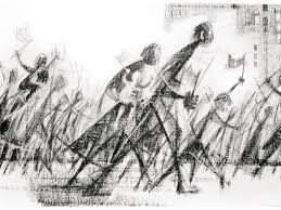 Then a new thought flowers. He looks again at his fallen compatriot For the first time in his life, he feels his brother’s pain. The unfolding blossom takes root is his brain. The elder looks into the faces that are facing him.